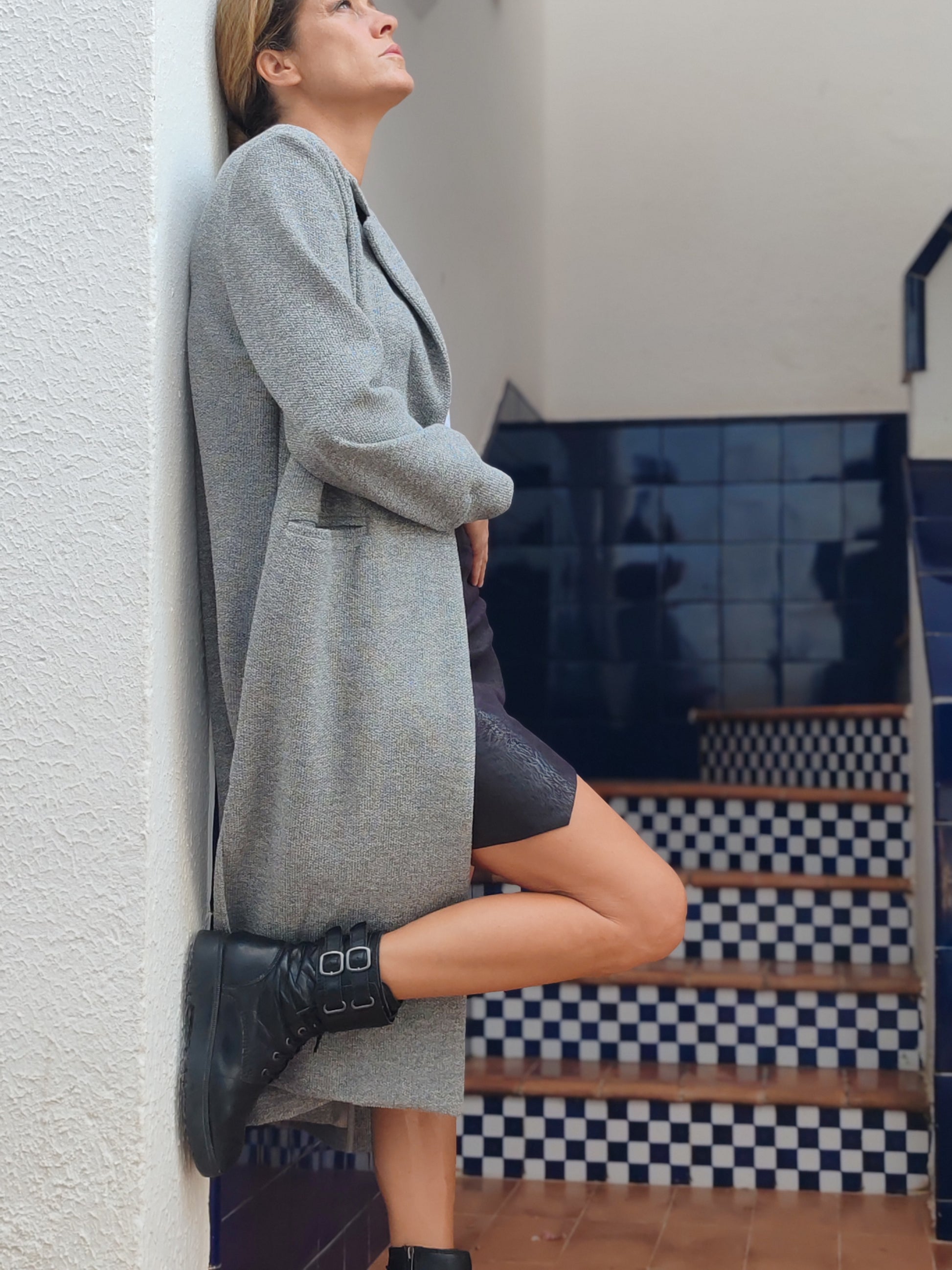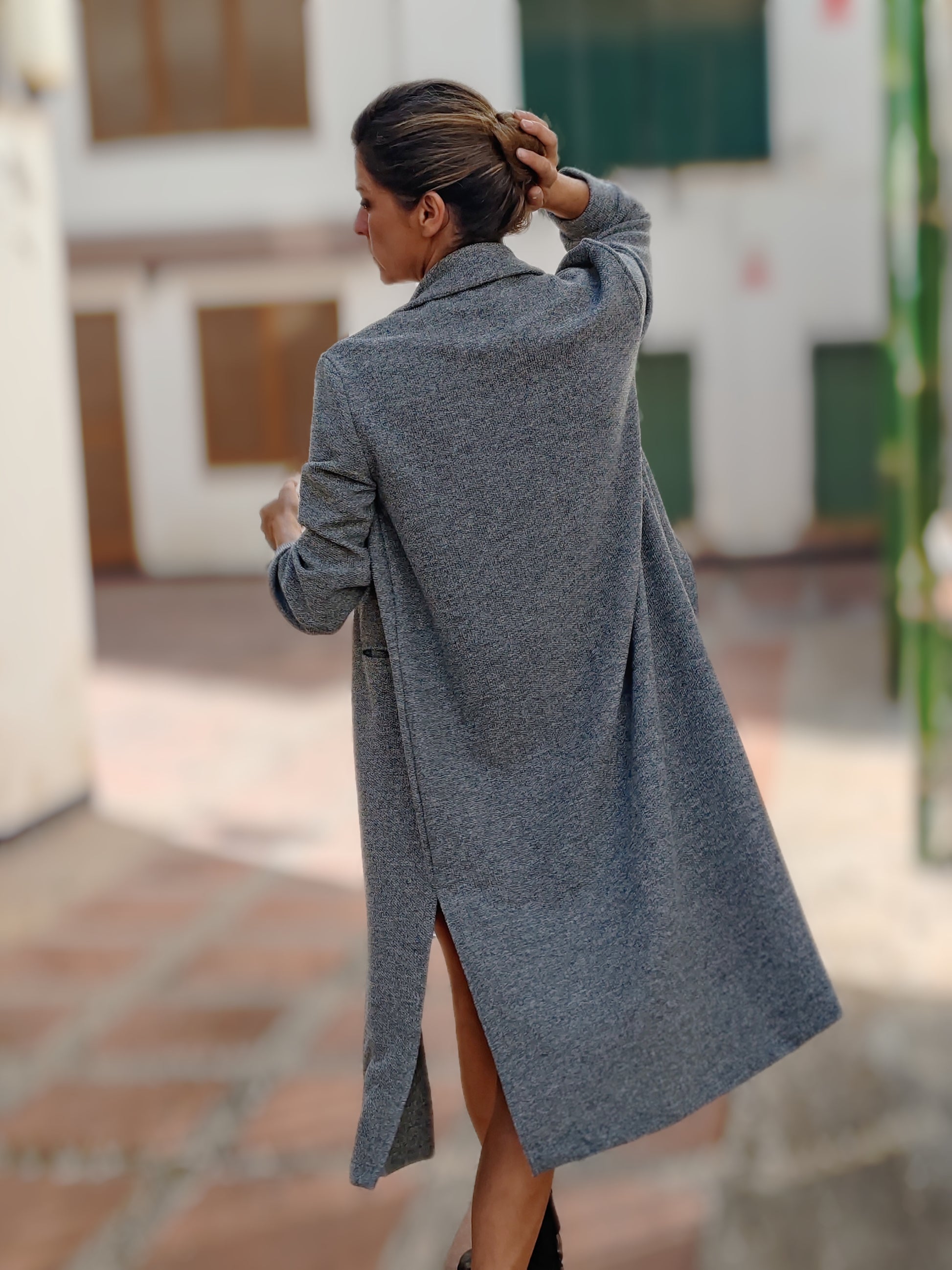 Abrigo largo en bouclé de color gris claro.