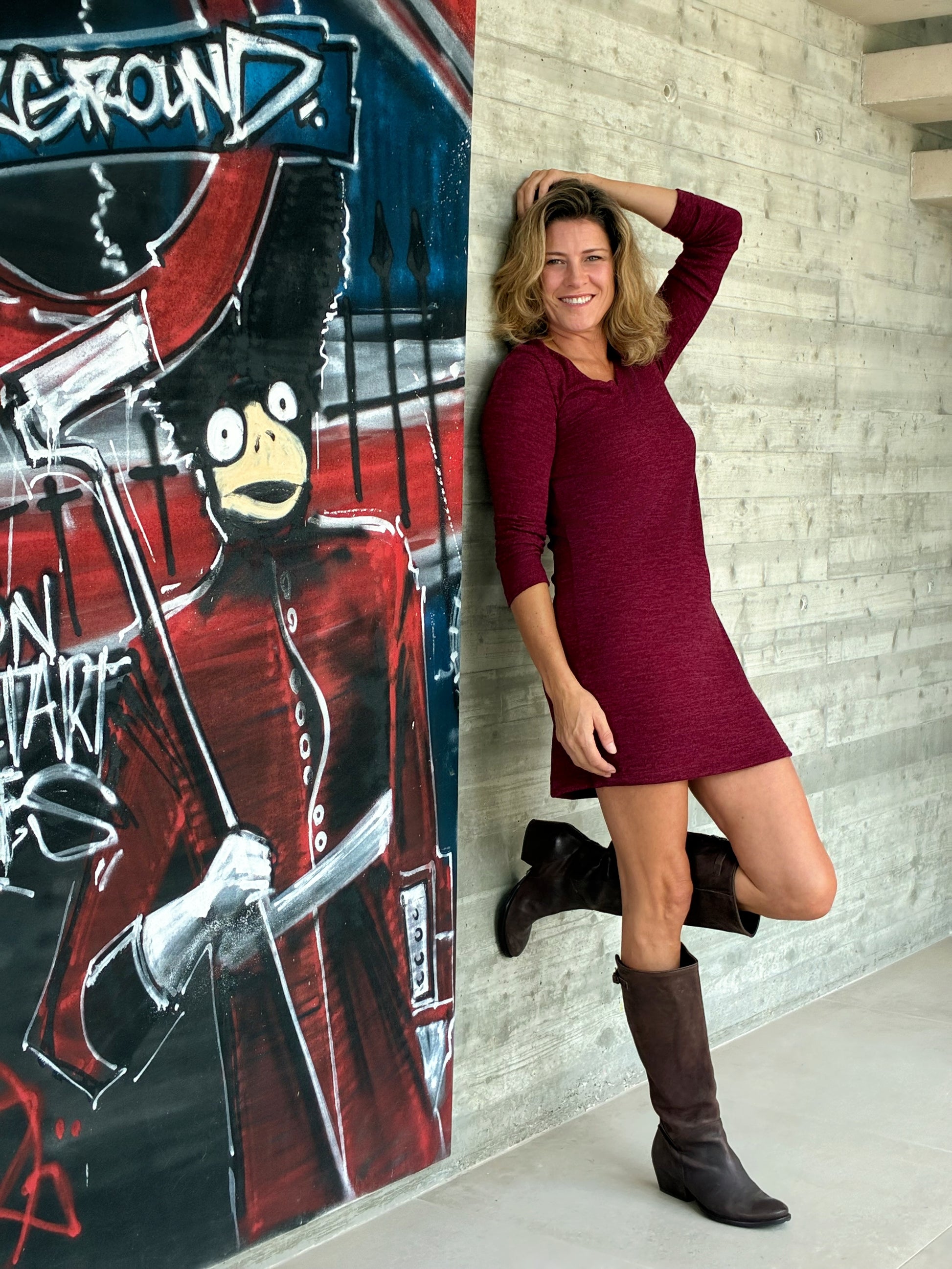 Vestido de punto granate reversible. Puedes elegir entre cuello redondo o cuello pico según te apetezca. Puedes llevarlo con o sin cinturón, es super cómodo y agradable. Se lava en la lavadora y no se arruga.